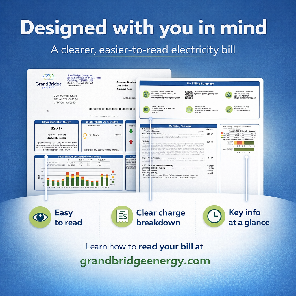 GrandBridge Energy is pleased to announce the launch of its new bill design, starting February 3. Designed to improve clarity and overall usability, you’ll want to keep an eye on your inbox or mailbox for the new bill to arrive.